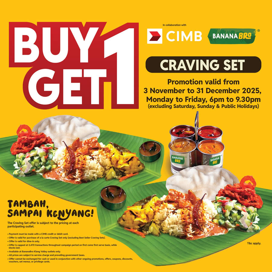 From 3 November to 31 December 2025, CIMB Credit and Debit Cardholders can enjoy a Buy 1 Free 1 Craving Set deal at BananaBro outlets in the Klang Valley. This promo is available Monday to Friday, from 6.00pm to 9.30pm – perfect for dinner with your makan gang after work!