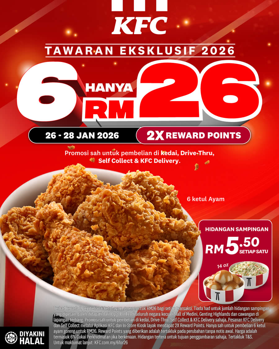 KFC is kicking off the year with a finger lickin’ good promotion that’s hard to resist ๐. For a limited three days only, fried chicken lovers can enjoy 6 pieces of KFC fried chicken for just RM26. This exclusive deal is perfect for sharing with family, friends, or even treating yourself ๐โจ.