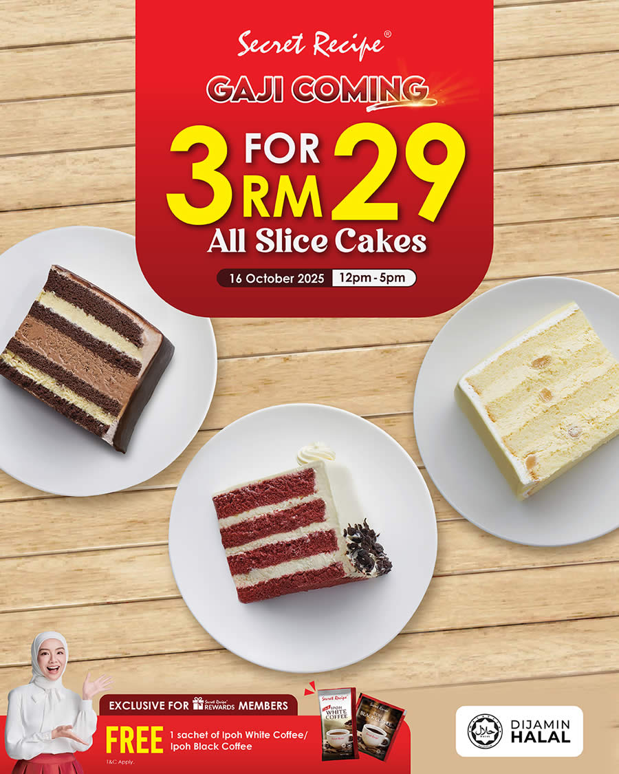 This “Gaji Coming” offer is the perfect way to reward yourself after a long month. Whether you love Red Velvet, Chocolate Indulgence, or creamy cheesecakes, there’s something for everyone. Don’t miss out – Secret Recipe’s 3-for-RM29 deal only happens on 16 October 2025 from 12pm to 5pm. Grab your cake, your coffee, and your happiness!