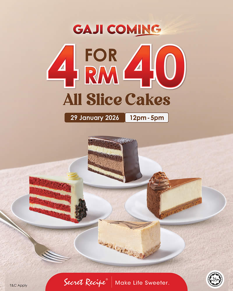 This Gaji Coming 4-for-RM40 sliced cake deal is a must-grab for dessert lovers looking to stretch their ringgit while enjoying quality cakes 🍰💖. Mark your calendar, set a reminder and make payday celebrations extra sweet with Secret Recipe!