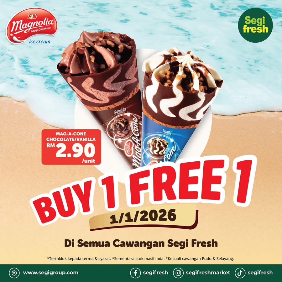 Ice cream lovers have a reason to celebrate the New Year with a refreshing and value-packed deal from Segi Fresh. For one day only, shoppers can enjoy a Buy 1 Free 1 promotion on the popular Magnolia Mag-A-Cone ice cream.
