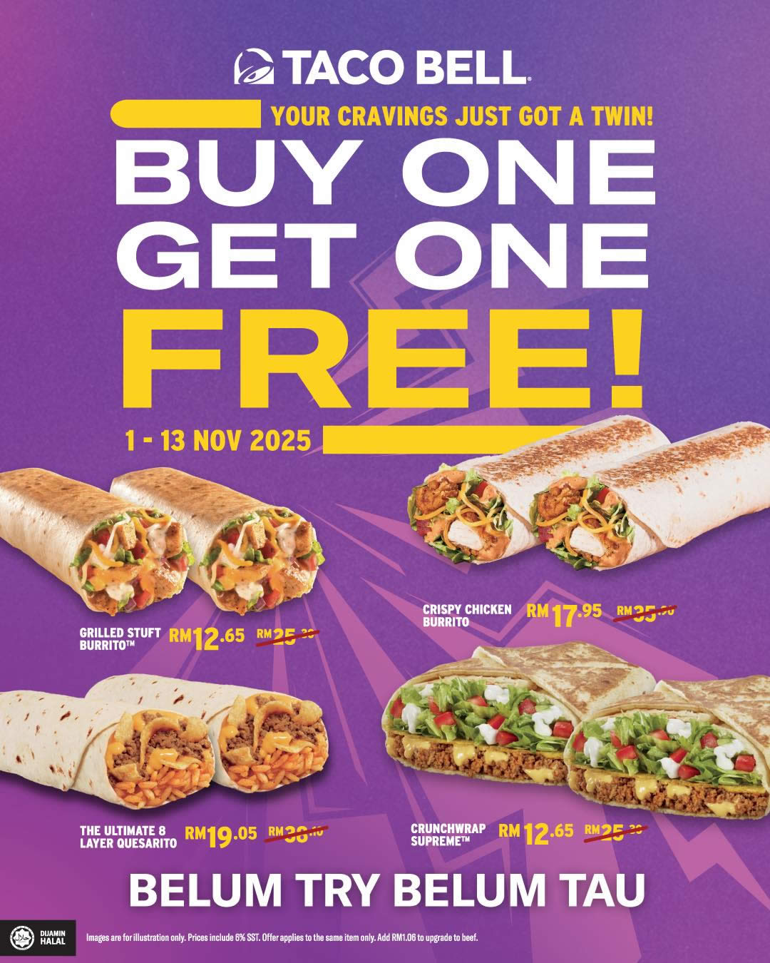 From burritos to the iconic Crunchwrap, Taco Bell’s Buy 1 Free 1 lets Malaysians double up on favourites without doubling the spend. It’s a short window – 1-13 Nov 2025 – so jom tapau kawan and chow down. Belum try, belum tau! 🌯💜