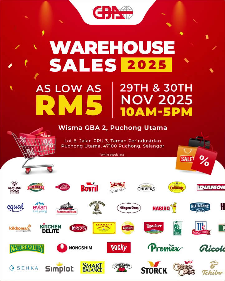 The highly anticipated GBA Warehouse Sale is making its comeback at Wisma GBA 2, Puchong Utama from 29 November to 30 November 2025. Shoppers can expect a wide variety of imported snacks, confectionery, pantry essentials and household favourites at irresistible prices – perfect for year-end stocking up! 😍